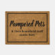 coirテクスチャーおもしろいプリントを搭載したdoormatと文字「ペットと彼らの家族スタッフはここに住んでいる」。