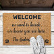 この形式でゲストおもしろいを歓迎!「ノックする必要はない、我々はあなたが来ているのを知っている。」 犬。素朴な自然のコーアと黒フェイク色のデザインを手でプリント。COPYRIGHT © 2022 Judy Burrows, Black Dog Art - All Rights Reserved.ペット犬のコーおもしろいルの入り口素朴をノック不要