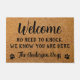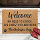 この形式でゲストおもしろいを歓迎!「ノックする必要はない、我々はあなたが来ているのを知っている。」 犬。素朴な自然のコーアと黒フェイク色のデザインを手でプリント。COPYRIGHT © 2022 Judy Burrows, Black Dog Art - All Rights Reserved.ペット犬のコーアの入おもしろい口のフォーマットをノックする必要はない
