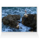 大きな海の大きい石岩の上に2つのペリカンが押し寄せる海の井戸に囲まれた写真。