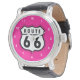 レトロクールルート66道路標識。古い黒と白のヴィンテージ、レトロなトラフィック、かわいいホットピンクの背景の道路標識。このアイテムで使用されているイメージはライセンスを受け、©グラフィックスFactory.com