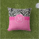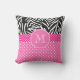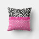 熱ガーリーモノグラムのいピンクと白の水玉模様模様の枕を持つ白黒ゼブラ。このデザインは、ホットピンクに白黒のゼブラパターンと小さな白い水玉模様を備えている。真ん中には、あなたのイニシャルとホットピンクの円がカスタムある。