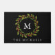 美しい水の色の緑のホリーと赤のベリーのリースはパーソナライズされた、黒い背景にあなたのイニシャルと家族の名前を設定してdoormat。