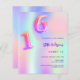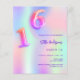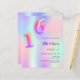 AとガーリーSweet 16フェミニンパーティの招待状。紫、ピンク、ミントグリーン、バラ金ゴールドの色の虹、ホログラフィックな背景。名前とパーティー・詳細のパーソナライズおよび追加名前は手書文字のスタイルと紫の色の文字です。16番はバ書ロンスタイルフォント、スクリプト付き。1枚= 1枚の招待状を印刷したエッジからエッジ