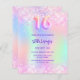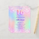 AとガーリーSweet 16フェミニンパーティの招待状。前面:紫、ピンク、ミントグリーンのホログラフィックカラーの虹。飾赤面の紙吹雪名前とパーティー・詳細のパーソナライズおよび追加名前は手書文字のスタイルと紫の色の文字です。1枚= 1枚の招待状を印刷したエッジからエッジ