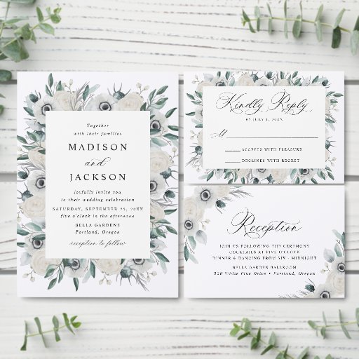 エレガントフローラ表の番号カード表の番号、名前、白い水の色のanemones、アイボリーのバラとダークセージの緑ので囲まれた日付を含ん葉だ。デザインは裏面で繰り返される。当社のホワイトアネモネスとバラのコレクションと共に結婚調整するように設計。このデザインを注文するにカスタマイズは、テーブル番号を一つずつカートに入れて下さい。