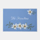 ヨーロッパインスパイアのドアマットで、青い色で描かれ、白いエデルワイスの花のグラフィックスが描かれています。 必要に応じて、ホワイトカスタム文字をカスタマイズします。