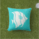 青い枕の上の白いヒマシの魚の片側と背中の白いストリップ。 Sandy Clossによるデザイン。海をテーマにした枕の装飾。デザインバイサンディクロス»