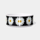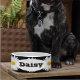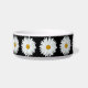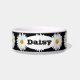 白いデイジーの花の写真を背景に黄色い中央を持ち、ペットの名前と繰り返し模様をプリントした猫や犬の陶芸製ペットフード。名前を自分のペットの名前に置き換えて自分のペットボウルをパーソナライズ。更にカスタマイズ文字サイズまたはフォントスタイルを調整する。素敵なフローラデザイン!ペットボウルサイズを選択。