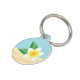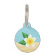 Desteiのイラストレーションの白いフランジパニプルメリアの花と緑の葉。背景色は青で、底に砂地の質感がある。背面には、ペットの名前と電話番号のパーソナライズ可能な文字領域がある。