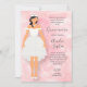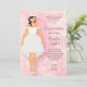 ピンクの水色の背景キンチェニェラのバースデーパーティ招待状かわいらしは、スカートの上にモダンは、かすかな銀の渦巻き模様のハイローのヘムのガウンを着た黒髪の女の子、腰の弓、肩の外のストラップ、パールネックレス、白いティアラと白い靴。お姫様の15歳の誕生日に最適。他のヘアカラーは私たちの店で利用可能。