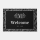 イニシャルモノグラムのを手描きの緑を黒い背景に置き、緑を黒と白でパターン(の模様が)ある縁どにしたドアマット。ようこそおはっきりしたフォント。ご家族が誕生した年を加算します。すべての文字はカスタマイズ可能です。