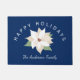 ダークブルーの背景に手で描いた白いポインセチアを特徴とするクリスマスドアマット。カーブした文字、上読に:ハッピーホリデー。文字カスタムの下部に、名前を追加できる。