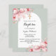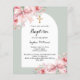白いアーチフレームとセージ緑の背景。ピンク飾の花とピンクの弓。黄金の十字架。名前と詳細のパーソナライズおよび追加1枚= 1枚の招待状を印刷したエッジからエッジ