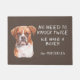 「二度もノックする必要はない、ボクサーがいる」と言うかわいいドアマット。文字は右側が白で、茶色と白のボクサー・ドッグの写真が離れある。すべてが灰色の茶色の背景に置かれる。