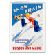 カップルが山を下るスキーを示す修復され、デジタル強化されたヴィンテージ旅行ポスター。スノートレイン。色を修正。不完全性の除去。