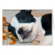 葉で遊んでいるボストンテリアの子犬