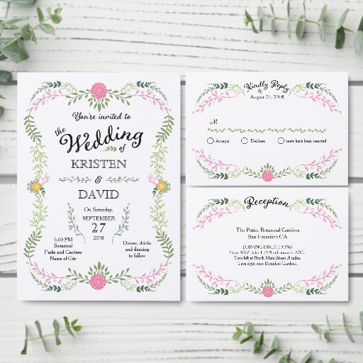 この素朴なボーホ結婚式招待状スイートは、リースに型枠を張る手描きのピンクと緑の葉を特徴としている。書モダンのアクセントはエレガントtouchを提供し、明るいパステル色は、このデザインを春や夏のお祝いに最適にする。