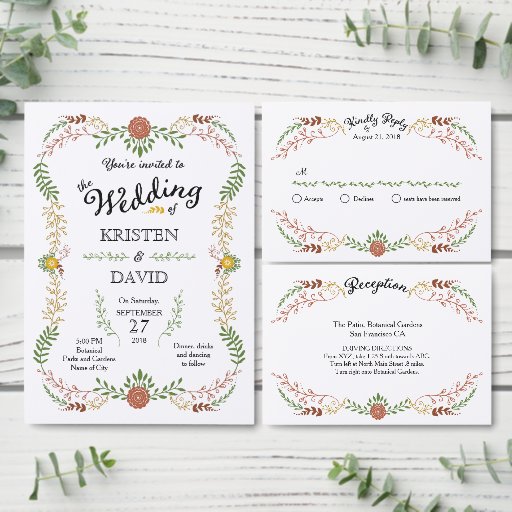 この素朴な坊ほ結婚式招待状スイートは、手で描かれた秋の葉を一緒に束ねてリースの型枠を特徴とする。書モダンのアクセントはエレガントtouch。