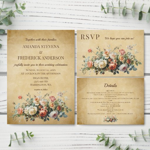 旧紙ヴィンテージフローラ配置結婚式招待状。