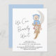 銀の月の上に座って青いテディベアの可愛い水色のイラストレーションと花模様とパンパスグラスのベージュとテラコッタのブーケを特色フレンドリーに、Boho予算男の赤ちゃんのシャワー招待、手書き書きスクリプトの"We Can Bearly Wait"。