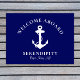 ネイビーモダンブルーの背景にいかりの白いイラストレーションを備えた、あなたのボートのためのシックなテーマのドーム。「Welcome Aboard」文字とボートの名前と場所をホワイトタイポグラフィでパーソナライズエレガントできる。