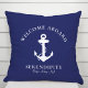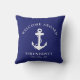暗いネイビモダンーの青い背景にいかりの白いイラストレーションを備えた、あなたのボートのためのシックなテーマの屋外の枕。「Welcome Aboard」文字とボートの名前と場所をパーソナライズできる。