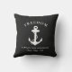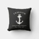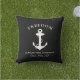 黒い背モダン景に白いいかりのイラストレーションを備えたボート用の屋外枕。あなたのボートの名前、キャプテンや家族の名前や似たもののための文字の行と場所でパーソナライズ。