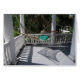 朝の太陽はハンモックが待つこの南ポーチの影を投げます。 カードの背部で、3つのロッキングチェアは占有者の準備ができたポーチで並べられます。