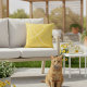 あなたのパティオのための完璧な明るい黄色の装飾装飾用クッション。心地よいと魅力を同時に屋外の居場所に追加。デザインは、マイヤーレモンのスライスを別の上に重ねている。