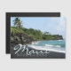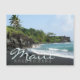 ハワイ州マウイ島のハナへの有名な道に沿ったワイアナパナパ州公園に火山性黒砂ビーチと磁気フォトハガキと黒と文字縁どの「マウイ、ハナへの道」。
