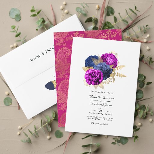 マゼンタのネイビーと金ゴールドフローラ結婚式招待状rsvpピンクのアクセント。任意の与えテーマまたは庭園の結婚式に最適。