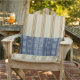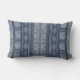 ネイビースタイリッシュブルーと白のマッドクロスインスパイアは、リネンのテクスチャに三角形、ダイヤモンド、正方形と垂直のプリントを持つエスニックな部族の幾何学的なストライプを持つ屋外の腰掛け枕の背景を見る。