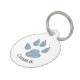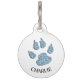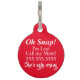 青のグリッターの足跡と犬の名前がフロントにプリントされた白い背景の名札。裏面は赤い警告の背景に白い文字で「OH Snap! 私は迷子です - ママに電話して、彼女はひどく泣いてる。」と書いてある。 赤い背景は、犬を見つけた人にタグに注意を向けるためのもので、警告を見逃さないようにする。