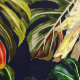 マンゴーとモンステラの間の黄色と白のコカトーのオウムの島の熱帯雨林葉。cherieuses_studioによる沿岸リビングコレクションの一部。