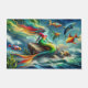 抽象芸術色彩の鮮やか油は、海と5つのその他のカラフルの時事的な魚やクジラと岩に座って赤と緑のトップに人魚の時事的なフィンの写真と見て彼女を青い空でシールのまわりに。このデザインは、鮮やかな金ゴールド稲妻の色と強力なポーズを備え絵を描ているドリップ