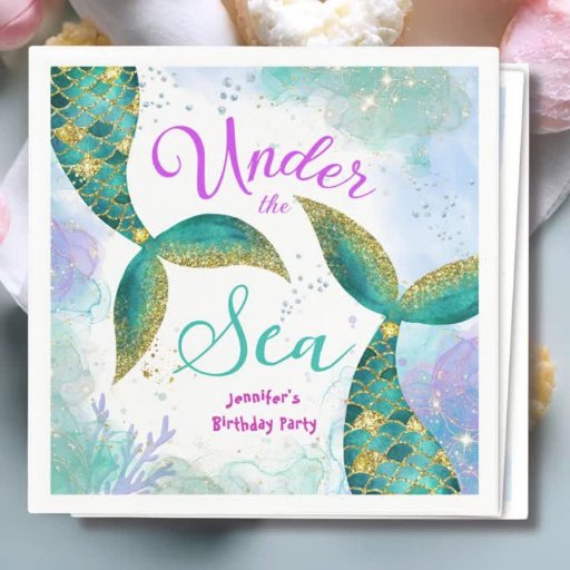 マーメイド2ndバースデーガールピンクティール(緑がかった色)アンダーザシー 招待状