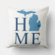 ウェルカムスタイリッシュピロー機能"ホーム"文字とミシガン州マップ。ネイビーブルーハートシティマーカーは、あなたが住んでいる都市の上に配置することができる。ネイビー、ブルー、ホワイト。枕の後ろストライプに横着の模様が着る。