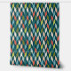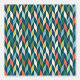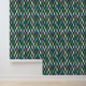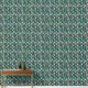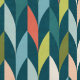 このミッドセンチュリーモダンパターンは、ティール(緑がかった色)とサンゴのヘリンボーンデザインを特徴とする。
