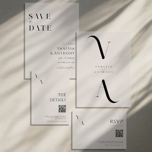 ミニマモダンリストブラックとアイボリー結婚式招待状。モノグラムエレガントタイポグラフィとグラフィックミニマルデザインを特長。特別な日のすべての詳細で文字をパーソナライズ。