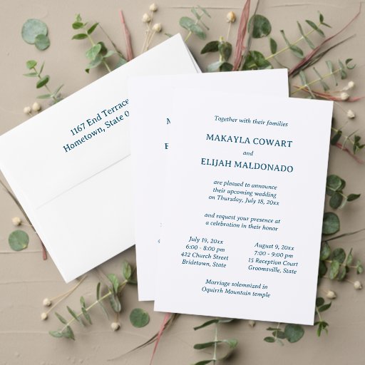 2人のお祝いに結婚関する情報を提供する宇宙を含むこの古典的なシンプル言語の青と白の結婚式のレセプションの招待状で始めから自分のトーンを設定する。この招ミニマル待は、新郎新婦が自分の故郷で披露宴やオープンハウスを持ちたいと願う結婚式に最適である。婚約写真を背面に追加すると、招待状そのもののシンプルさに合わせて自動的に白黒に変換される。