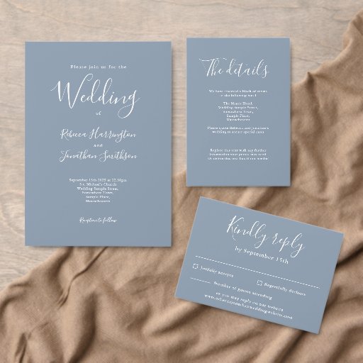 ミニマルScript Dusty Blue Wedding RSVPカード