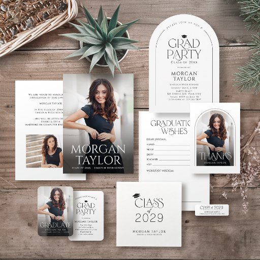 白黒シンプルミニサイズ卒業発表と招待状は、写真と洗練された写真と洗練されたセリフフォントを備えた優雅なセリフのを備えエレガントてシンプル、自分の写真とグラッドパーティーの情報をバックにカスタムして。