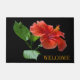 ミラノの赤いハイビスカスのドアのドアマット。 最も大きいサイズで示されている。 一致の歓迎された木箱は利用できる枕署名し。