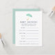 ベビーシャワーのゲストに、赤ちゃんの性別、生年月日と時刻、体重、身長を予想してもらいましょう!イベントの入口に積み重ねて置き、回したり、各席に置いたり。きれいな箱やバインダーにまとめると、ママになる人の楽しい記念品にもなります。性別にこだわらないデザインで、淡いミントグリーンの水彩傘のイラストが上部に、モダンな文字と裏面に微妙な点線のダイヤモンド模様が特徴です。