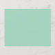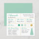 ミントグリーンとゴールドのウェディングにぴったりな花嫁の介添え人情報カード。カードには、ウェディングの日程と場所、ウェディングカラー、ブライズパーティーの情報、介添え人ドレスの詳細、介添え人への提案メッセージなどが含まれます。介添え人の名前とタイトルは、濃いミントグリーンのエレガントなスクリプトで書かれています。下隅にはミントグリーンのドレスのイラストがあり、中央にはゴールドの円を含めたウェディングカラーが円形で表示されています。ドレスの色など、カラーは変更可能ですが、ゴールドの円は偽ゴールドの箔押し加工が施されています。デフォルトのカラーは、ミントグリーン3色とホワイト、ゴールドです。カードの裏面は、介添え人ドレスと同じ色のライトミントグリーンです。