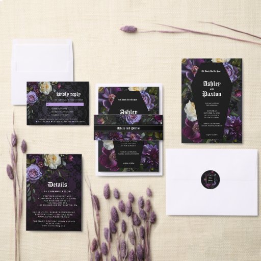 ロマンチックでムーディーフォーマルな、この結婚式招待状は洗練されたモダンゴシックに最適結婚である。ムーディなフローラデザインは、濃い黒い水の色の背景の豪華な配置に紫と埃の多いラベンダーの花と濃い緑のを持つブラックベリーの自然な花束を特徴とす離れる。裏側はダークレースパターンである。全ての結婚詳細は特別カスタマイズな日のニーズを満たすことができる。