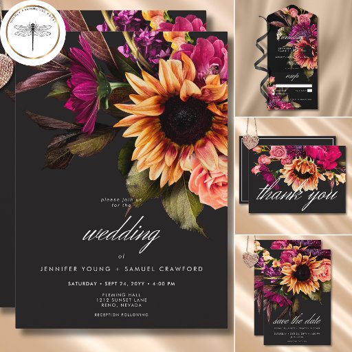 夏の夕日の華やかな美しいや秋の収穫の豊かな色合いを魅力的な結婚式招待状で受け入れる。ドラマチックでありながら柔らかい黒い背景は、息をのむほどリアルな花束に最適なキャンバスを提供する。色の想像爆発は、深いマゼンダと紫のミムを特徴とし、金ゴールドオレンジサンフラワーと共に柔らかいピンクのバラはっきりしたスを特徴とする。緑豊かな濃い緑の葉が配置を完了し、自然の優雅さのtouchを追加。この魅惑的なデザインは、あなたの愛の物語の情熱的な強さを反映し、どんな季節にも最適である。あなたの結婚詳細はスクリプトで表示さエレガントれ、ドラマチックな背景に対して美しく目立つ。この魅惑的なスイートは、あなたの特別な日に祝の本当に忘れられない招待を作成する。Simple Farmhouse Pressによって作成。