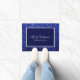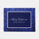 青いエレガントグリッター枠に囲まれた青い背景に白い文字が付いたメリークリスマスドールマット。家族の名前または文字でパーソナライズ