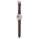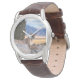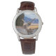 メンズクラシックの茶色の革のストラップウォッチ野生動物の山のライオンの写真のプリントで示された。この時計を複数のスタイルから選ぶ。こカスタマイズの時計は買まに見える。ストックイメージ